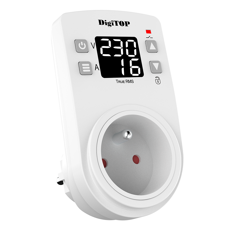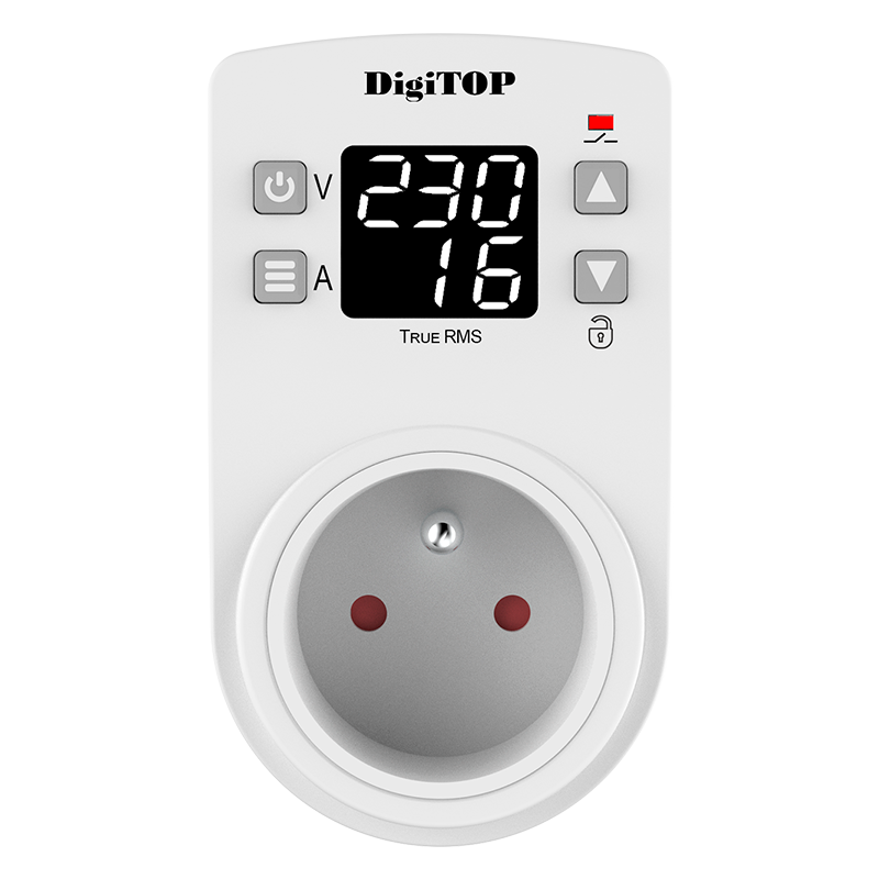 Przekaźnik napięciowy z kontrolą prądu DigiTOP VA-16Sens — przeznaczony jest do ochrony urządzeń elektrycznych i urządzeń AGD podłączanych bezpośrednio do gniazdka przed niedopuszczalnymi wahaniami napięcia. Urządzenie w sposób ciągły analizuje napięcie sieciowe, a jeśli przekroczy ono ustalone granice, podłączone urządzenia zostają wyłączone. Obciążenie jest automatycznie włączane, gdy napięcie powróci do określonego zakresu.