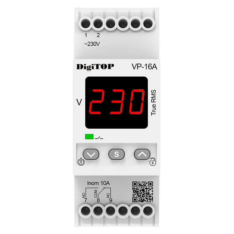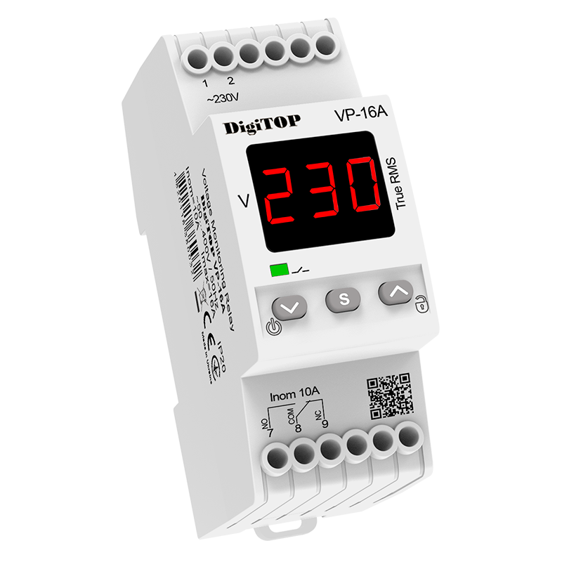 Przekaźnik napięciowy DigiTOP VP-16А – przeznaczony jest do ochrony urządzeń elektrycznych i sprzętu gospodarstwa domowego przed niedopuszczalnymi wahaniami napięcia (dom, mieszkanie, biuro itp.)