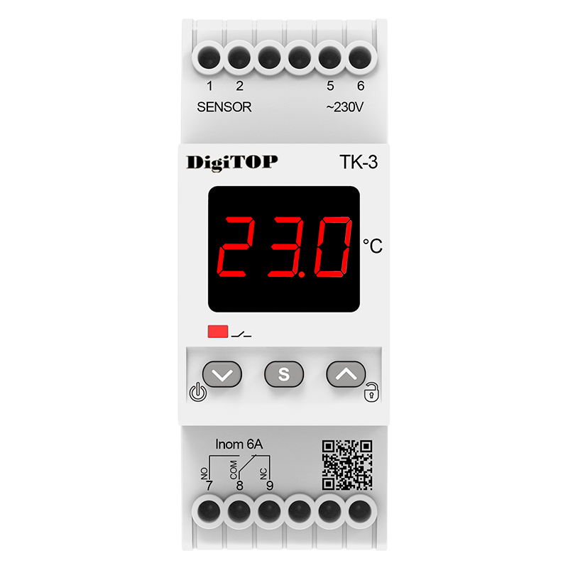 Regulator temperatury (Termoregulator) DigiTOP TK-3 przeznaczony jest do regulacji i utrzymywania temperatury (zakresu temperatur) w pomieszczeniach mieszkalnych i przemysłowych poprzez włączanie i wyłączanie urządzeń grzewczych lub chłodzących. Regulator temperatury monitoruje temperaturę na jednym kanale (czujniku) i wyświetla jej aktualną wartość na cyfrowym wskaźniku LED. Czujnik temperatury (w zestawie, długość przewodu 1,5 metra) umieszcza się w obszarze, w którym konieczne jest utrzymanie reżimu temperaturowego.