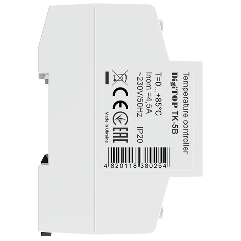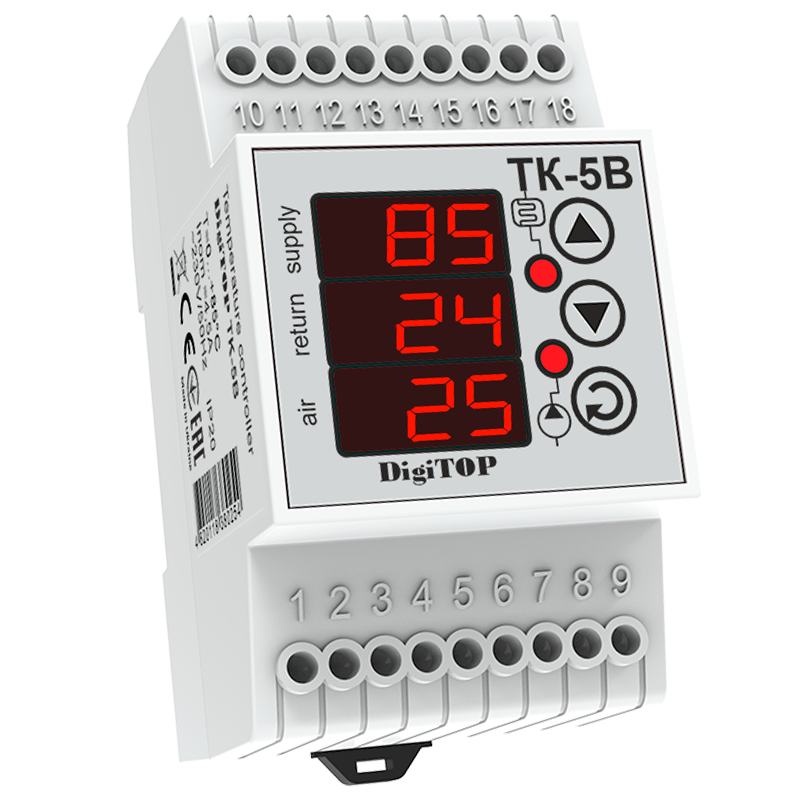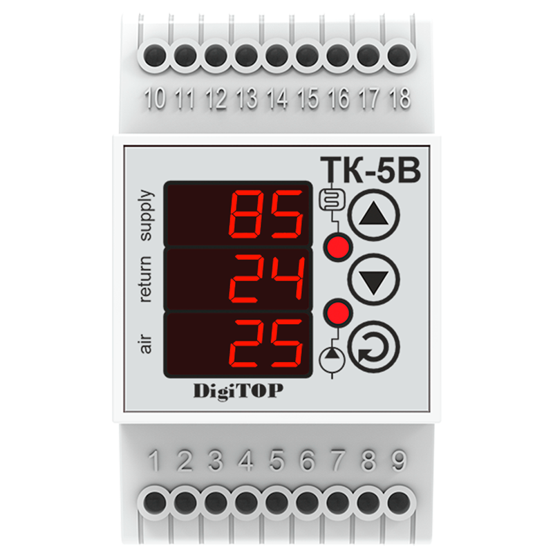 Termoregulator (regulator temperatury) DigiTOP TK-5B przeznaczony jest do sterowania elektrycznymi systemami grzewczymi (TEN, kocioł elektrodowy itp.) z kontrolą temperatury zasilania (Supply), powrotu (Return) i powietrza (Air) w ogrzewanym pomieszczeniu z możliwością sterowania trybem pracy pompy w systemie ogrzewania. Regulacja temperatury odbywa się poprzez utrzymywanie ustawionej temperatury powietrza w ogrzewanym pomieszczeniu. Zastosowanie termoregulatora pozwala zmniejszyć pobór energii elektrycznej i uzyskać najkorzystniejsze warunki temperaturowe w ogrzewanym pomieszczeniu.