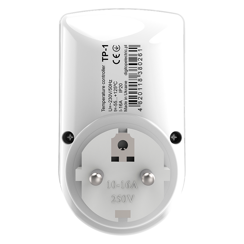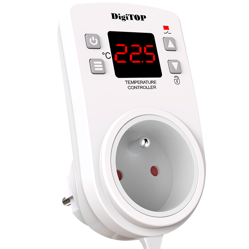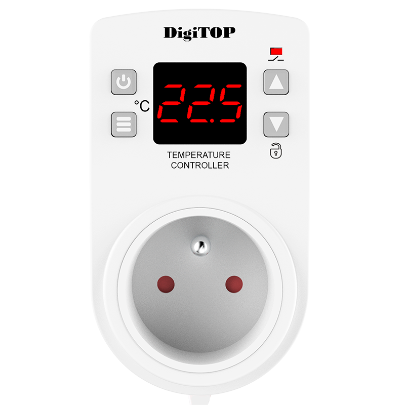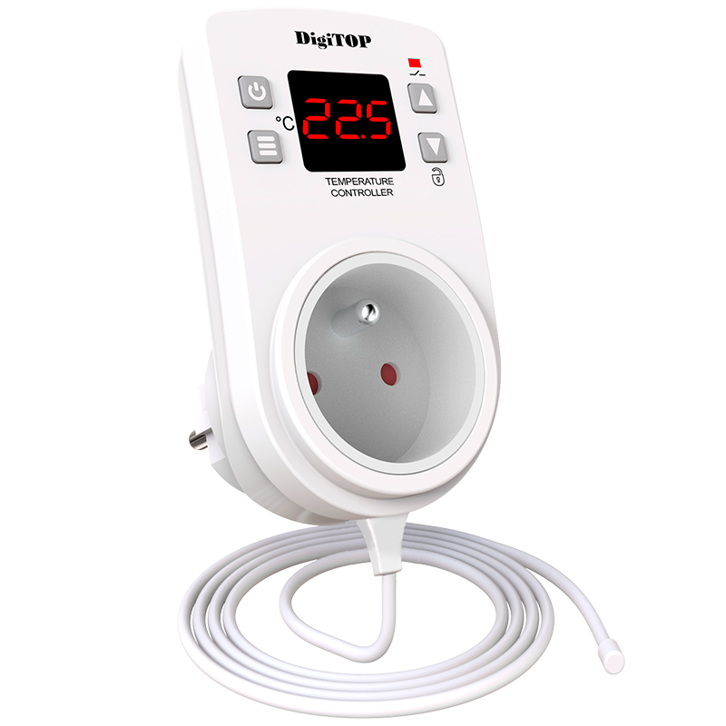 Regulator temperatury (Termoregulator) DigiTOP TP-1 przeznaczony jest do regulacji i utrzymywania temperatury (zakresu temperatur) w pomieszczeniach mieszkalnych i przemysłowych poprzez włączanie i wyłączanie urządzeń grzewczych lub chłodzących. Regulator temperatury monitoruje temperaturę na jednym kanale (czujniku) i wyświetla jej aktualną wartość na cyfrowym wskaźniku LED. Czujnik temperatury (długość przewodu 1,5 metra) umieszcza się w obszarze, w którym konieczne jest utrzymanie reżimu temperaturowego.